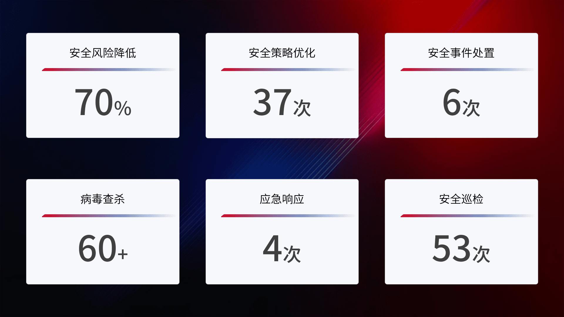 提供全面的安全事件报告体系,,,包括处置报告、、周报、、、、季度和年度总结,,结合持续监控,,,帮助客户深入了解网络安全状况。。。