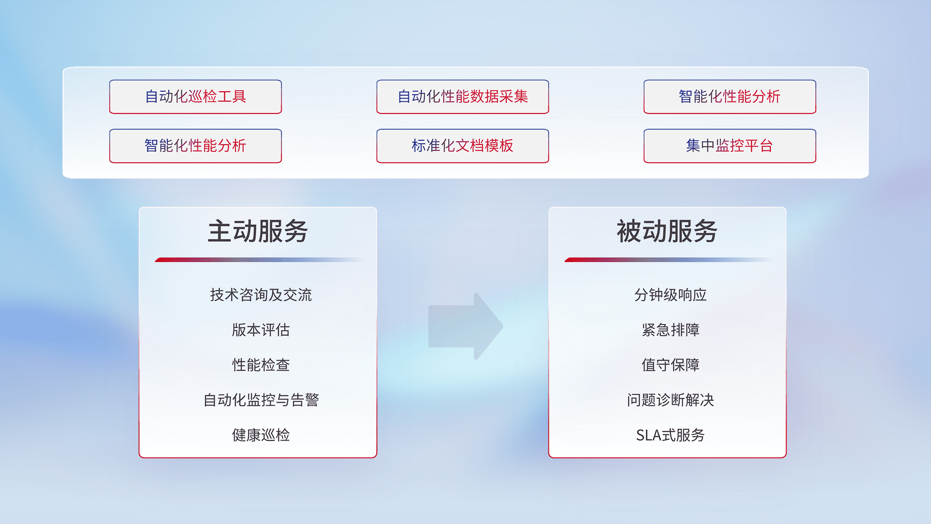 智能化工具和标准化文档,,,,保障服务质量,,提供主动服务(包含技术咨询、、、版本评估、、性能检查、、自动化监控与告警、、、、健康巡检)和被动服务包含(分钟级响应、、、、紧急排障、、、、值守保障、、问题诊断解决、、SLA服务)。。